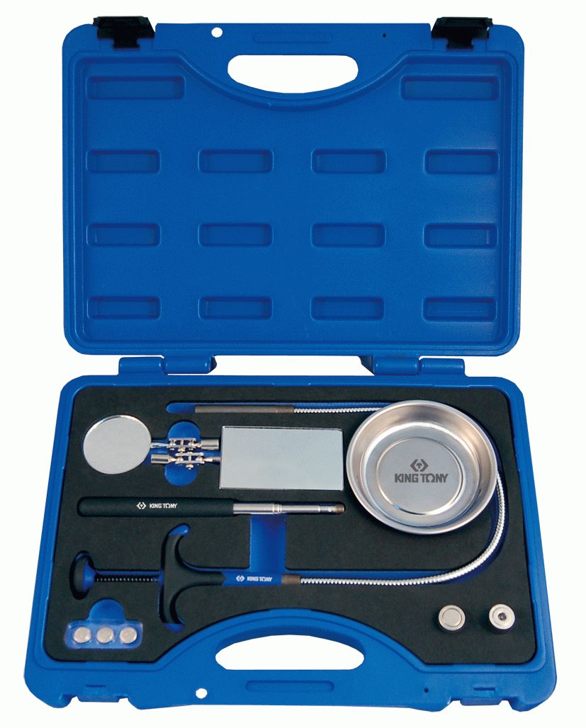 Инспекционный набор KING TONY 9TQ01. Любой ремонт невозможно представить без сопутствующих аксессуаров и приспособлений, которые помогают в работе. Заглянуть в труднодоступное место, подсветить узел агрегата, достать упавшую в недра двигателя небольшую деталь, магнитная тарелка для сбора мелкого крепежа – для всего этого предназначен новый набор марки KING TONY.